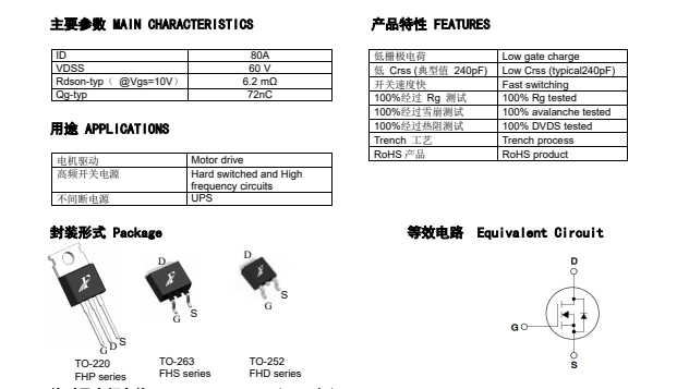 具有80A、60V的電流、電壓,RDS(on) = 6.2mΩtyp) ,最高柵源電壓@VGS =±20 V,100% EAS測試,100% Rg測試,100% DVDS熱阻測試,一致性高,高可靠性,開關速度快,低導通內阻RDS(on),低Crss。