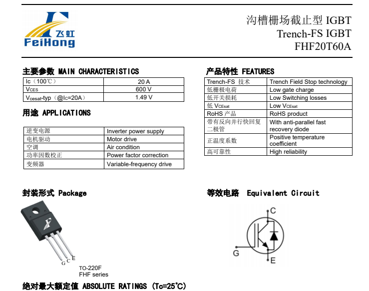 當(dāng)然,在應(yīng)用中,我們電機(jī)驅(qū)動研發(fā)工程師一定要了解這款優(yōu)質(zhì)FHF20T60A國產(chǎn)IGBT單管的詳細(xì)參數(shù):其具有20A, 600V, VCEsat典型值:1.49V-typ ,<1.7V;ID (Tc=100℃):20A;BVCES:600V;IF(A)(Tc=25℃):20A;IF(A)(Tc=100℃):10A。